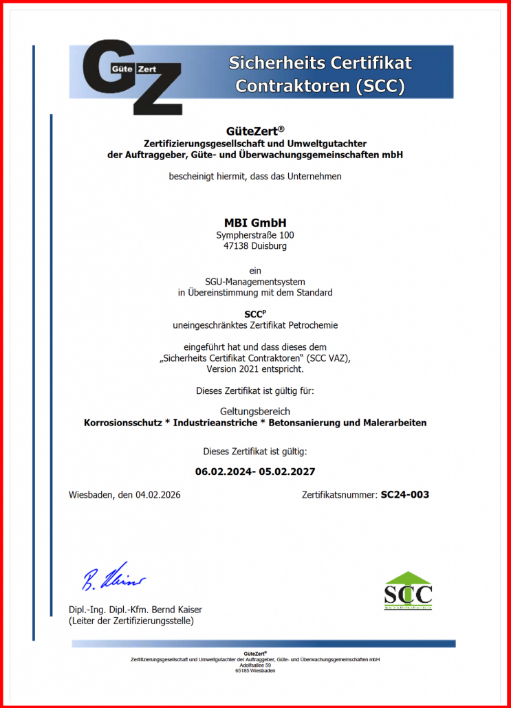 - Qualitätsmanagement Zertifikat: Geltungsbereich – Korrosionsschutz, Industrieanstriche, Betonsanierung und Malerarbeiten MBI GmbH – Zertifikat Qualitätsmanagement nach DIN EN ISO 9001:2015 gültig bis 5.2.2026